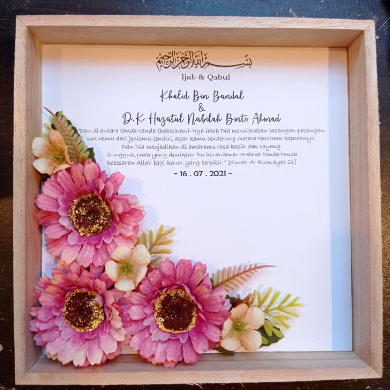 Pembelian frame dengan gubahan bunga dan nama sekali (tidak termasuk duit mas kahwin) pembayaran mengikut harga yang dipaparkan duit mas kahwin .
